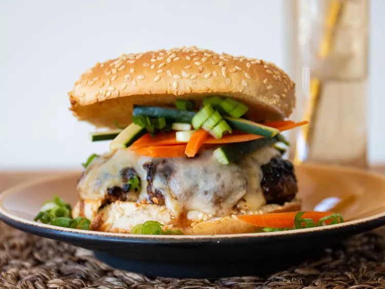 - Mix ground beef, green onion, hoisin sauce, Sriracha sauce, sesame oil, garlic powder, red pepper flakes, ginger, salt, and black pepper together in a bowl until thoroughly combined. Divide meat mixture into quarters; form each portion into a patty.