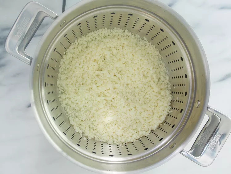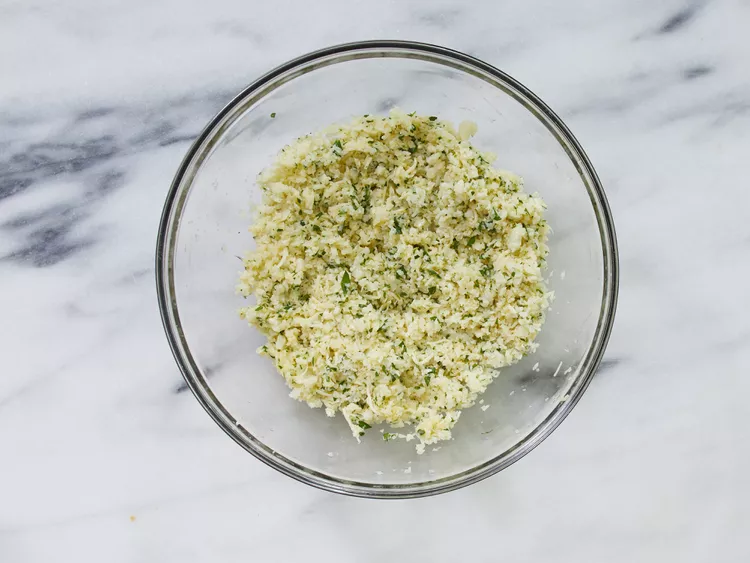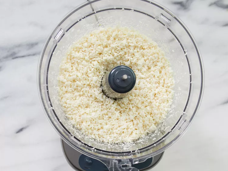 - Place cauliflower pieces through the feeding tube of the food processor using the grating blade; pulse until all the cauliflower is shredded.