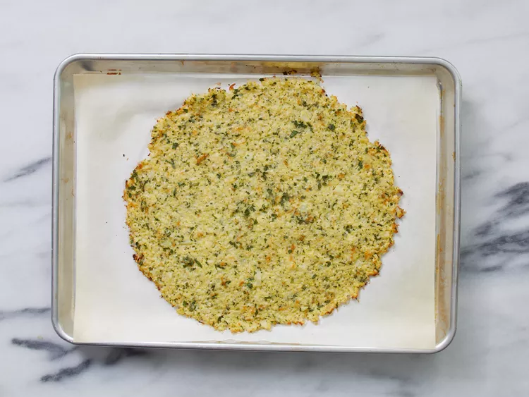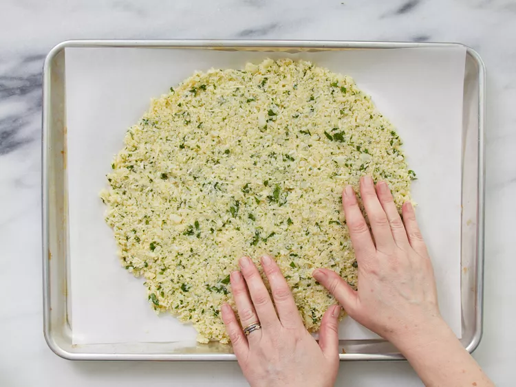 5. Pour mixture onto the prepared baking sheet; press and shape into a pizza crust.