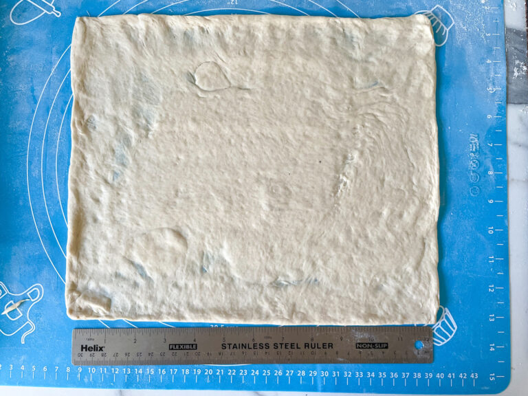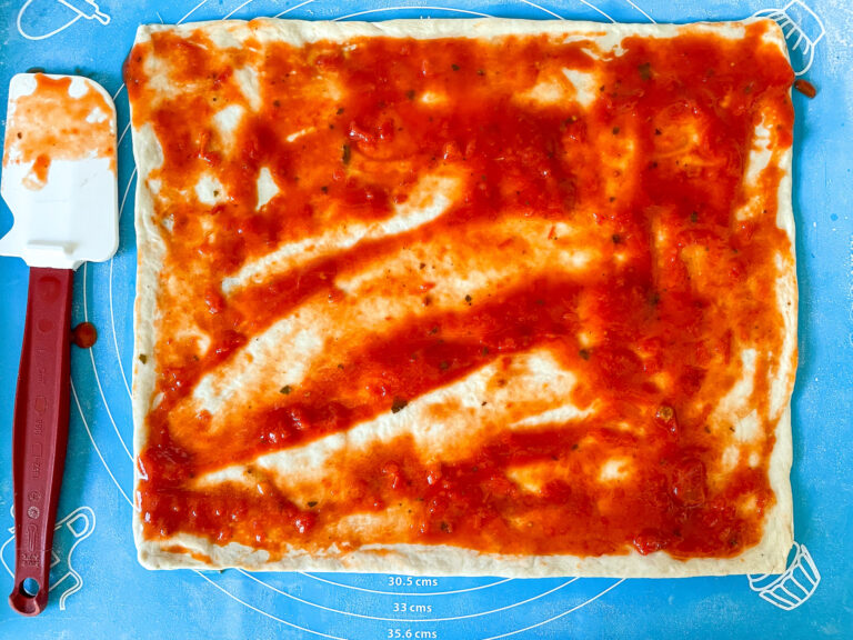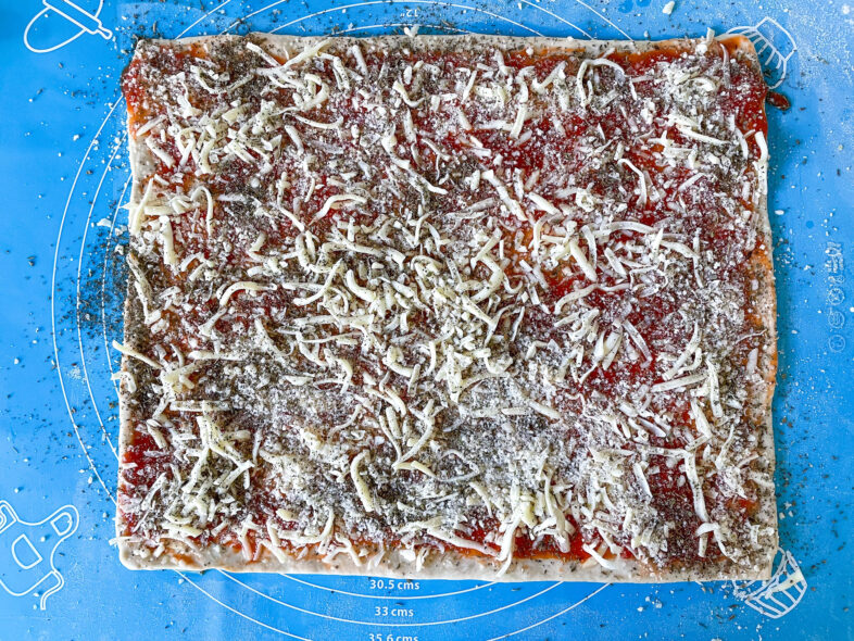2. On a silicone rolling mat or lightly floured countertop, roll the pizza dough to approximately 11 x 13 inches. Trim the edges so the dough forms an even rectangle, about 10 1/2 inches x 12 inches. Position the rectangle with the longer side facing you.