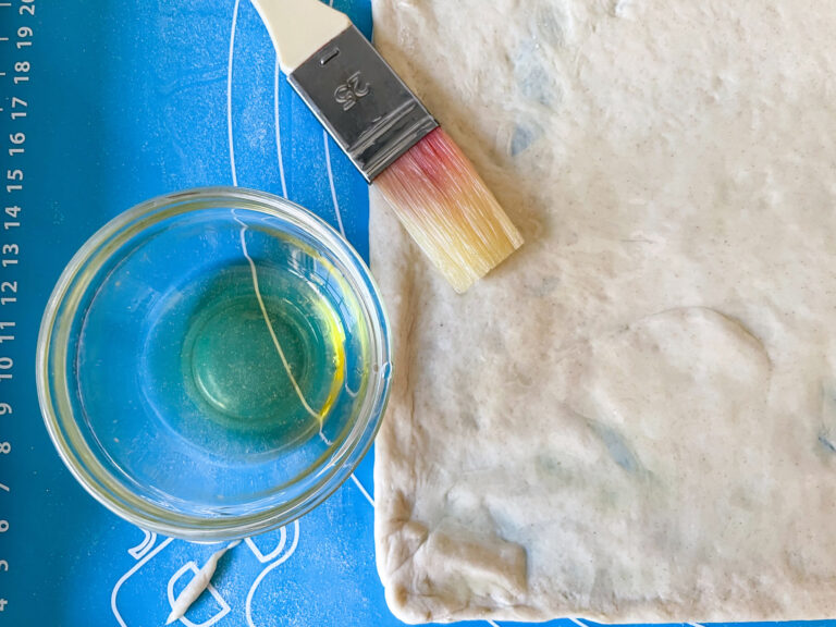 3. With a pastry brush, brush the dough with garlic oil, evenly coating the entire surface.