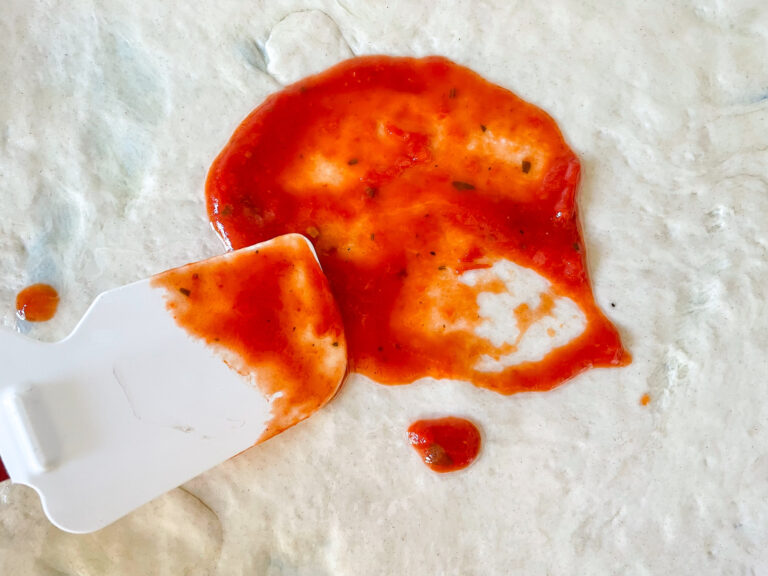 4. Use a rubber spatula to spread the marinara sauce evenly over the dough.