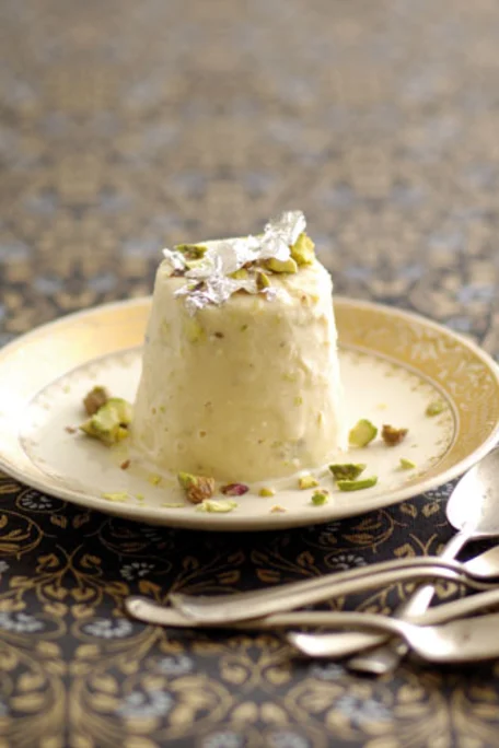 3. Every 20 minutes remove the kulfi dish from the freezer and, using electric beaters or a fork, give the kulfi a good whisk to break up the ice crystals. When the mixture is stiff, divide it among the moulds and freeze until hardened completely. Dip the moulds in hot water and turn out the kulfi. Sprinkle with the remaining pistachios and decorate with a piece of edible silver leaf, if using.