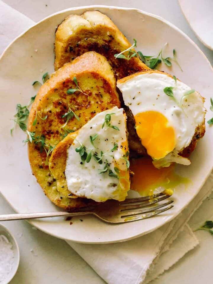- Top each serving of French toast with a fried egg, sprinkle of salt and pepper and fresh microgreens. Serve.