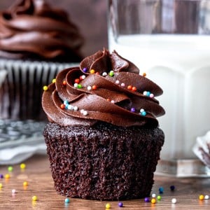 - Frost the cupcakes using a piping bag and your favorite cupcake piping tip (I used a 1M) or a flat edge knife. Optionally decorate with chocolate chips or sprinkles.