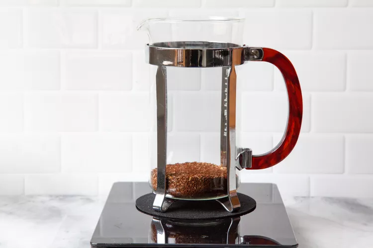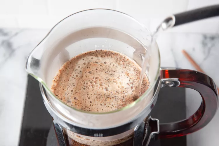 Place the coffee grounds in the carafe of a French press coffee machine.Pour the water into the French press. Using a chopstick or small wooden spoon, stir the grounds in the water to make sure all the grounds are wet.