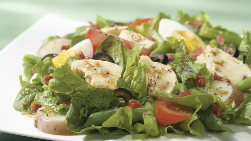 - On extra-large serving platter, arrange all ingredients except dressing. Just before serving, drizzle with dressing.