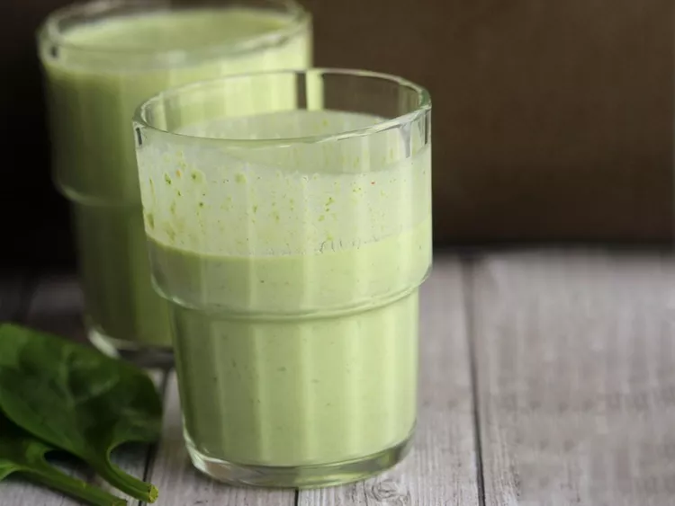 - Blend milk, yogurt, banana, peanut butter, spinach, and ice cubes until smooth.