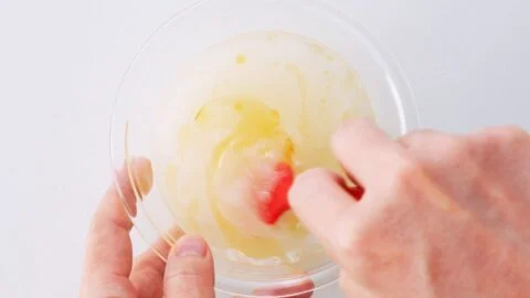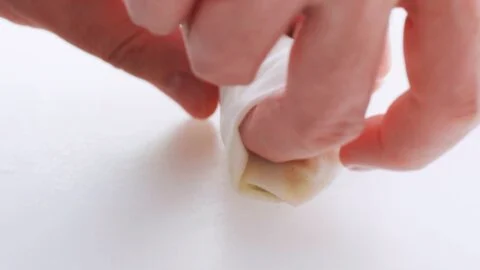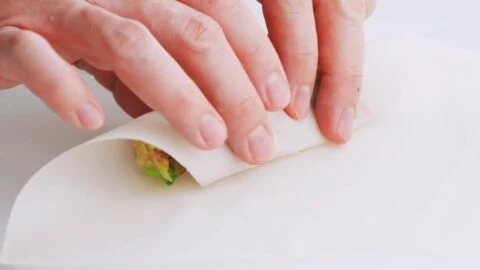 13. Spread some of the flour glue onto the wrapper’s top edges and then loosely finish rolling the Harumaki. I usually put the tips of two fingers into either end of the roll as I roll it.