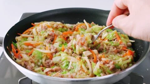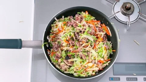 5. Make space in the center of the pan by pushing the veggies to the sides. Add the pork and use a spatula to break it up into small crumbs. When the ground meat is no longer one mass, stir-fry it together with the vegetables until the pork is mostly cooked through.