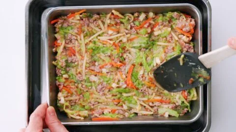 7. The filling needs to cool before you can stuff the Harumaki, and you can speed this up by spreading the mixture in a metal tray and floating it in a cold water bath.
