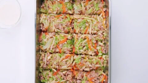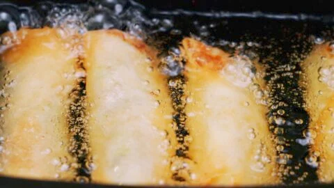 15. Heat a heavy-bottomed pot filled with 1.5-inches of oil to 360 degrees F (180 C) and fry the rolls in batches. They will float, so you need to continue rolling them over so they brown evenly. When the wrapper is crisp, transfer the rolls to the prepared bowl and drain them for a minute before serving them.