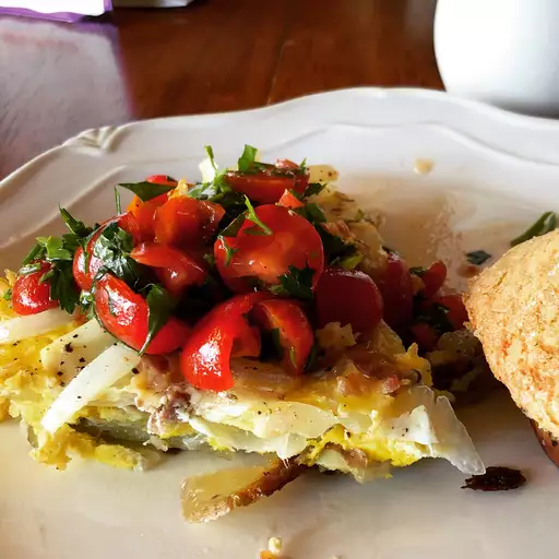- Serve warm, garnished with tomato and green onion.