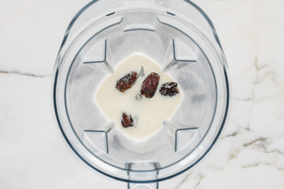 1. Place dates and 1/2 cup almond milk into a high powered blender and blend until dates have broken down into small tid-bits.