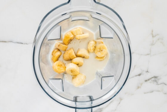 2. Add frozen banana chunks, remaining almond milk and ice cubes into blender and blend until smooth. Add additional almond milk or ice to reach desired consistency, if needed.