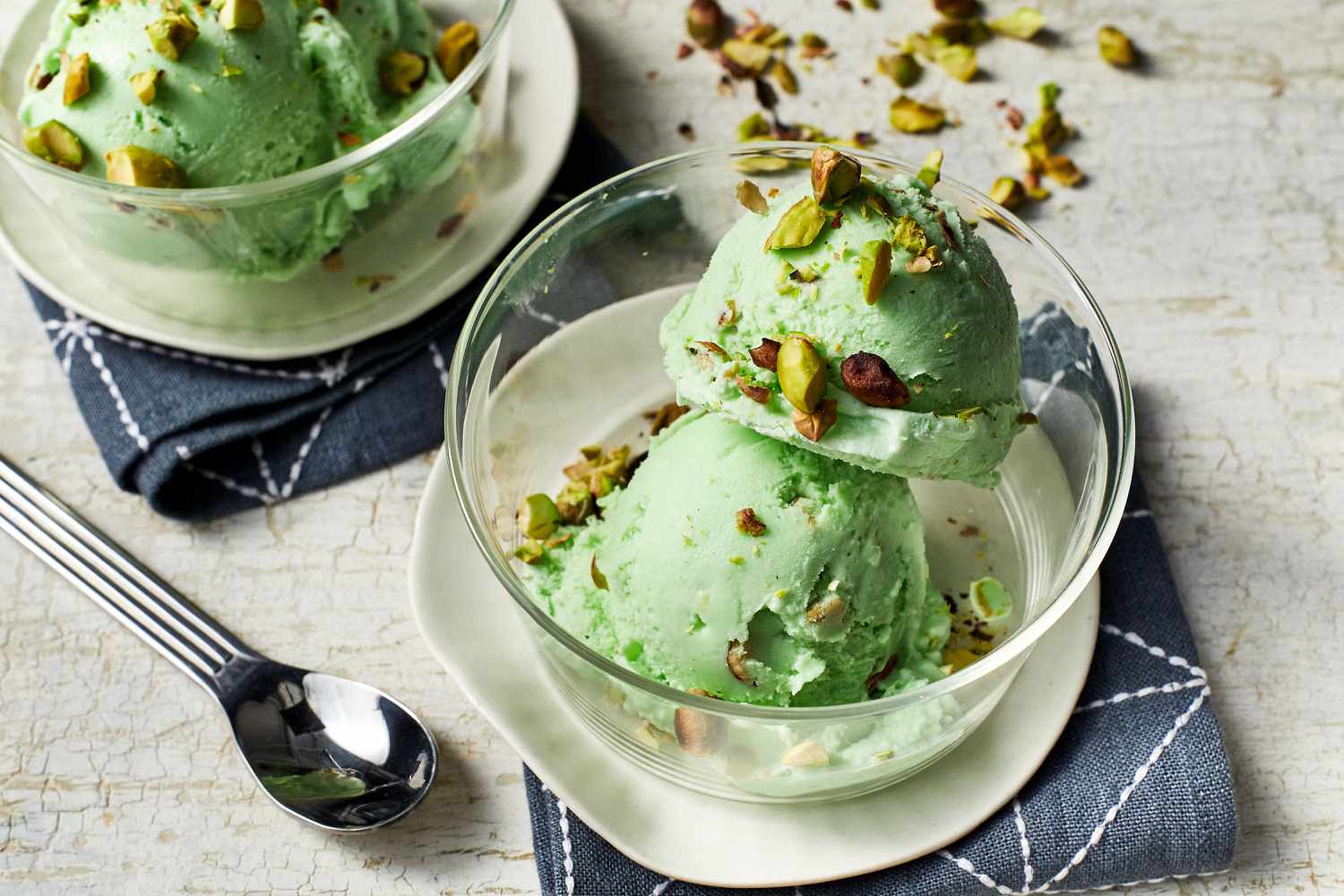 - Stir chopped pistachios into cold cream mixture. Pour mixture into frozen freezer bowl of a 2-quart electric ice cream maker, and proceed according to manufacturer’s instructions. (Instructions and times may vary.) Transfer to a shallow container; press parchment paper against surface. Cover with plastic wrap (or seal lid on container), and freeze until frozen, at least 4 hours, before serving. Store in an airtight container in freezer up to 2 weeks.