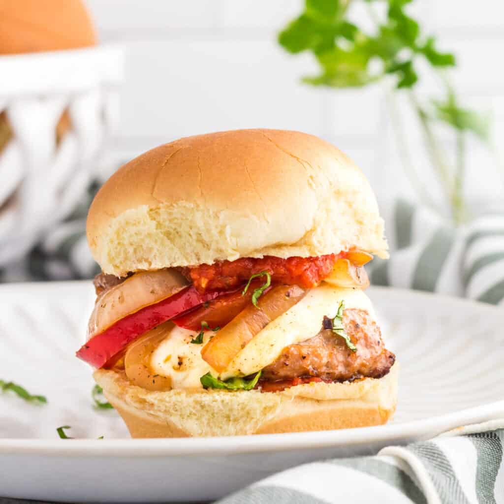 - Build each slider with a patty, then peppers and onions and topped with as much marinara as you like. You can also add a final garnish of a basil leave if you like.
