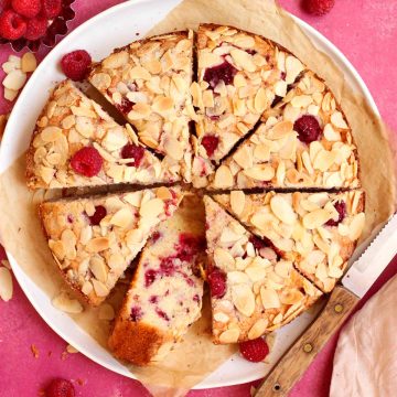 - Reserve a few raspberries for topping, and then fold the rest in gently. Use an offset spatula to gently spread it out into the pan. Poke the few reserved raspberries on top over the batter. Sprinkle almonds evenly over the surface and then sprinkle the sugar over top.