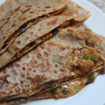 - Place one rolled paratha near you, spread some sauce over it and spread filling over it, Sprinkle olives over it. cover with other paratha, seal the edges.