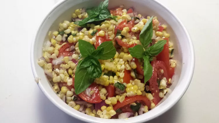 - Toss corn, tomatoes, onion, basil, oil, vinegar, salt, and pepper in a large bowl; chill until serving.