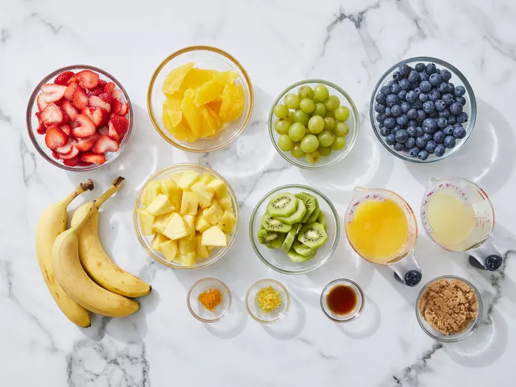 4. For the salad: Layer fruit in a large, clear glass bowl in this order: pineapple, strawberries, kiwi fruit, bananas, oranges, grapes, and blueberries. Pour cooled sauce over fruit; cover and refrigerate for 3 to 4 hours before serving.