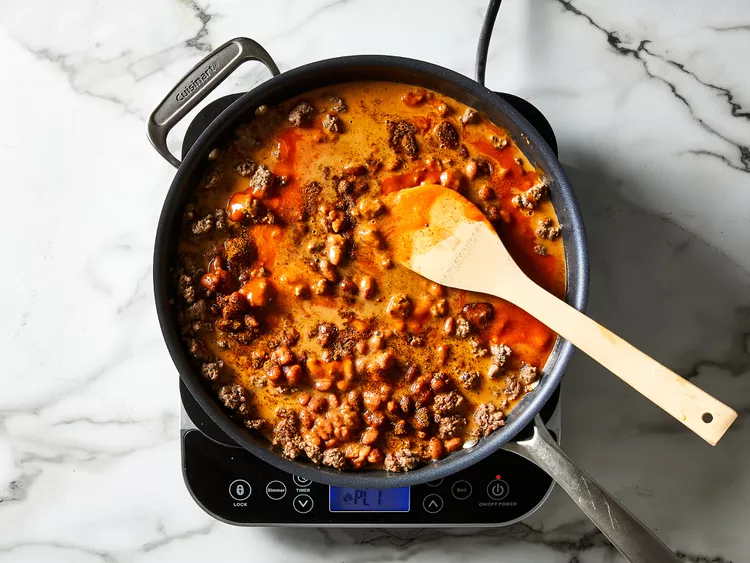 - Heat a large skillet over medium-high heat. Cook and stir ground beef in the hot skillet until browned and crumbly, 5 to 7 minutes. Drain and discard grease. Stir in chili beans, French-style dressing, and seasoning mix. Fill the empty dressing bottle 2/3 full of water and add to the skillet. Bring to a boil, reduce heat, and simmer for 15 minutes.
