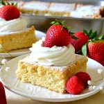 - Bake for approximately 30-40 minutes or until a toothpick inserted near the center comes out clean or with moist crumbs. Cool completely before cutting into squares. Dust with confectioners’ sugar if you’d like and serve up with more fresh whipped cream and fresh berries.